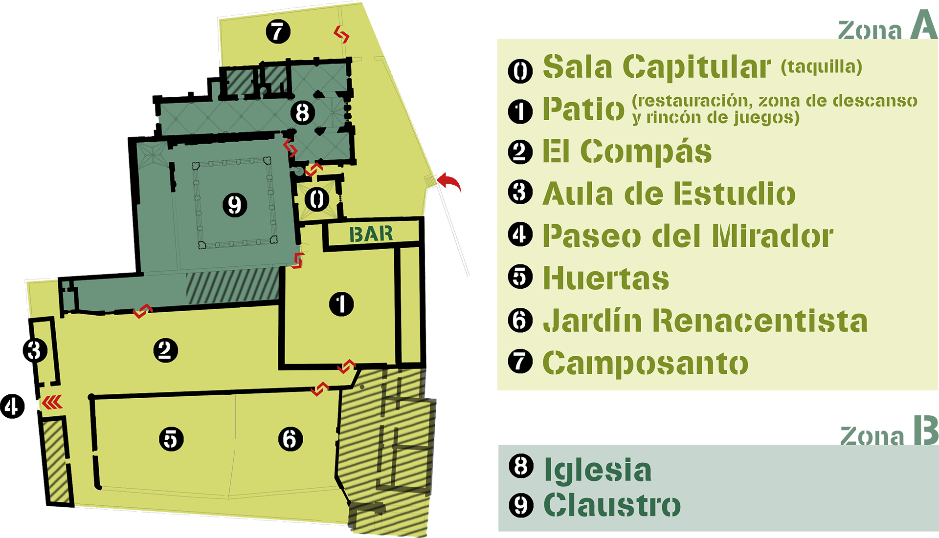 Zona A: El Patio (restauración y descanso), el Compás, el Camposanto, el Aula de Estudio, las Huertas, el Jardín Renacentista, el Paseo del Mirador y las Visitas guiadas